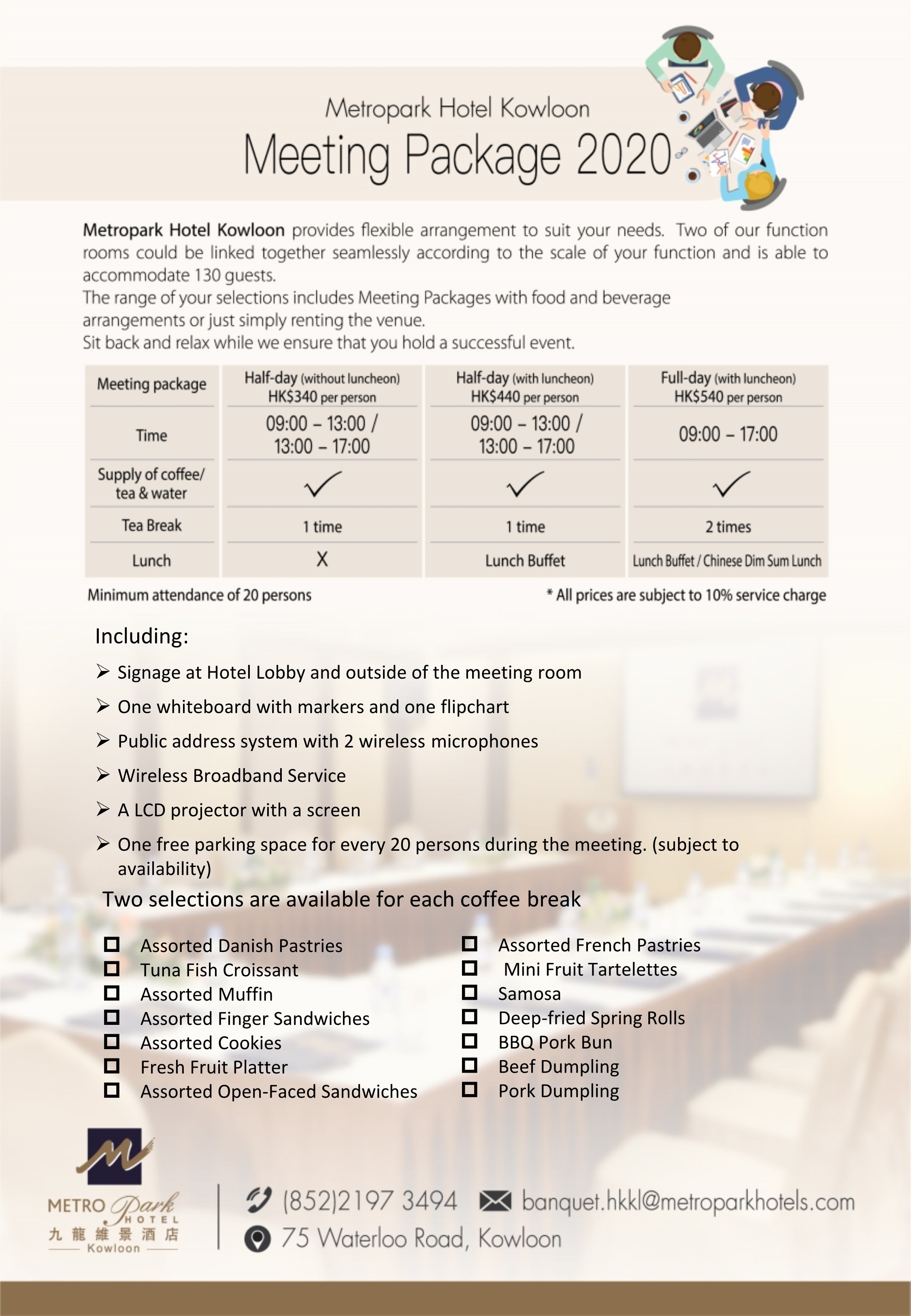九龍維景酒店宴會部將為你提供貼身服務,令你可輕鬆安排各項活動。場地有2個多功能會議廳適合安排各大小類型會議,總面積更可容納多至150人,或你可選擇度身訂造之會議套餐及只租用會議場地。我們有多種會議套餐,定有一款能迎合你的要求。